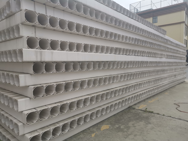 PVC 多孔管屬柔性塑料管, 白色, 材料為硬聚氯乙烯,常用的是七孔梅花管和七孔蜂窩管,其規(guī)格型號為 110 32 × 7。 PVC 多孔管采用承插式接口, 使用 PVC膠進行密封防水處理, 具有水密性好